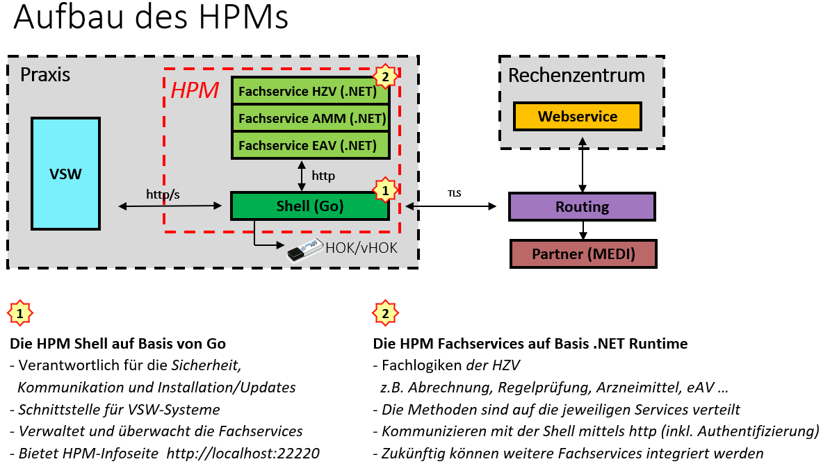 - Fachservices: Komponenten innerhalb des HPM. Ein Fachservice ist zuständig für fachbezogene Dienste und Prüfungen (HZV-, AMM-, EAV-Fachservices) Sowohl Shell als auch Fachservices können als Windows-Dienst oder Daemon (Hintergrundprozess) betrieben werden.
